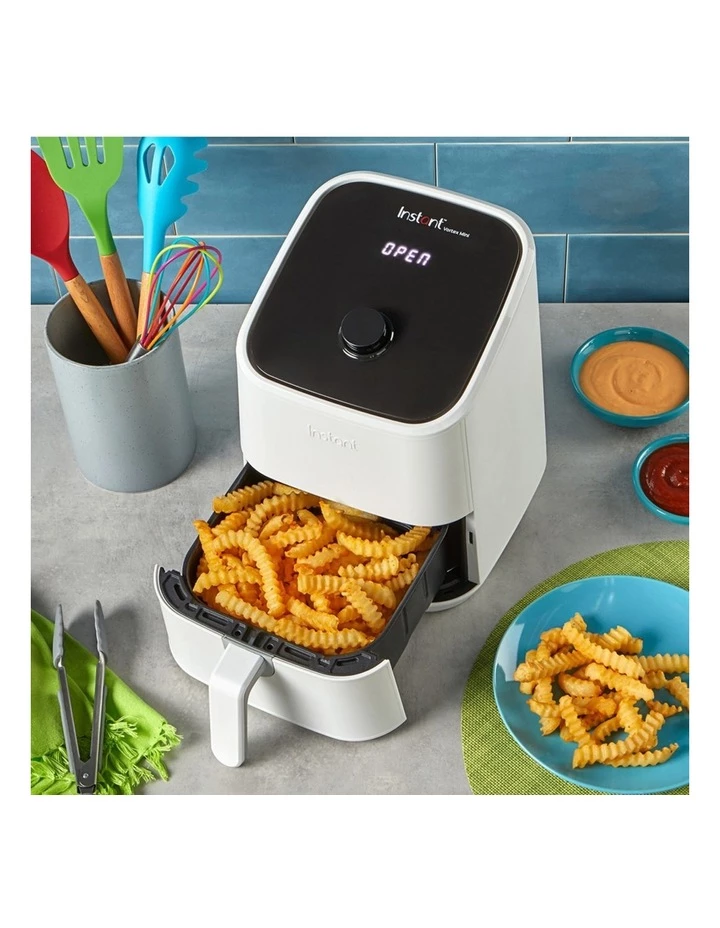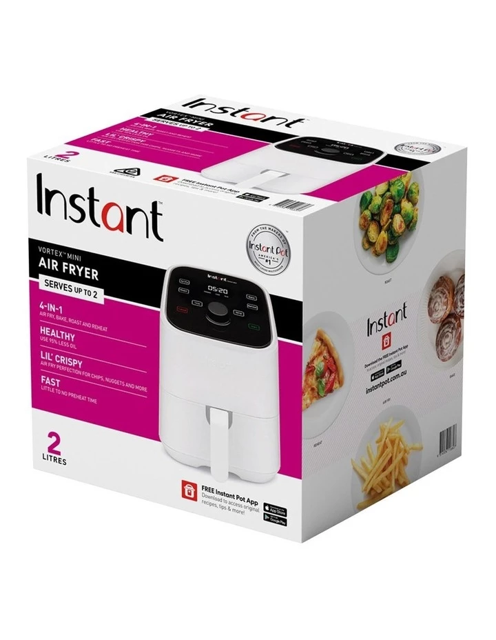 Instant Vortex Mini Air Fryer 2L, 4-in-1 Mini Air Fryer Smart Cooking Programs 4 pre-set Smart Cooking Programs that can be customised to your preference. Crispy Air Fry perfection with chips, nuggets and more EvenCrisp Technology For crisp, tender results every time. Healthy and Delicious Use 95% less oil for all your favourite fried foods. Sacrifice the calories, not the experience! Countertop Friendly.