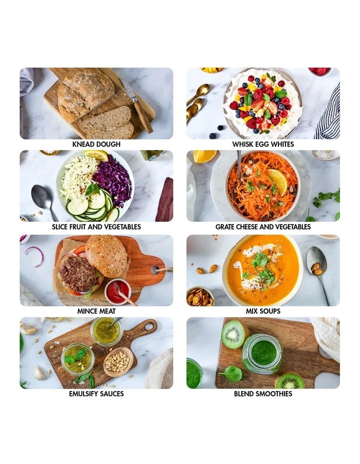 - Slices, Grates, Chops, Whisks, Blends & Kneads
