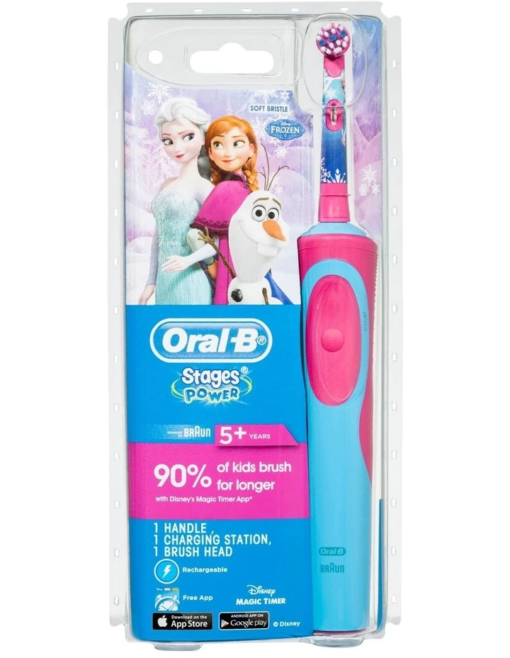 Oral-B Stages Rechargeable Electric Toothbrush with Disney characters features extra-soft bristles for kids’ mouths. Its round head cleans better* for healthier gums (*vs. a regular manual toothbrush). Compatible with Oral-B’s Disney Magic Timer App. Oral-B is the #1 Toothbrush brand used by dentists worldwide