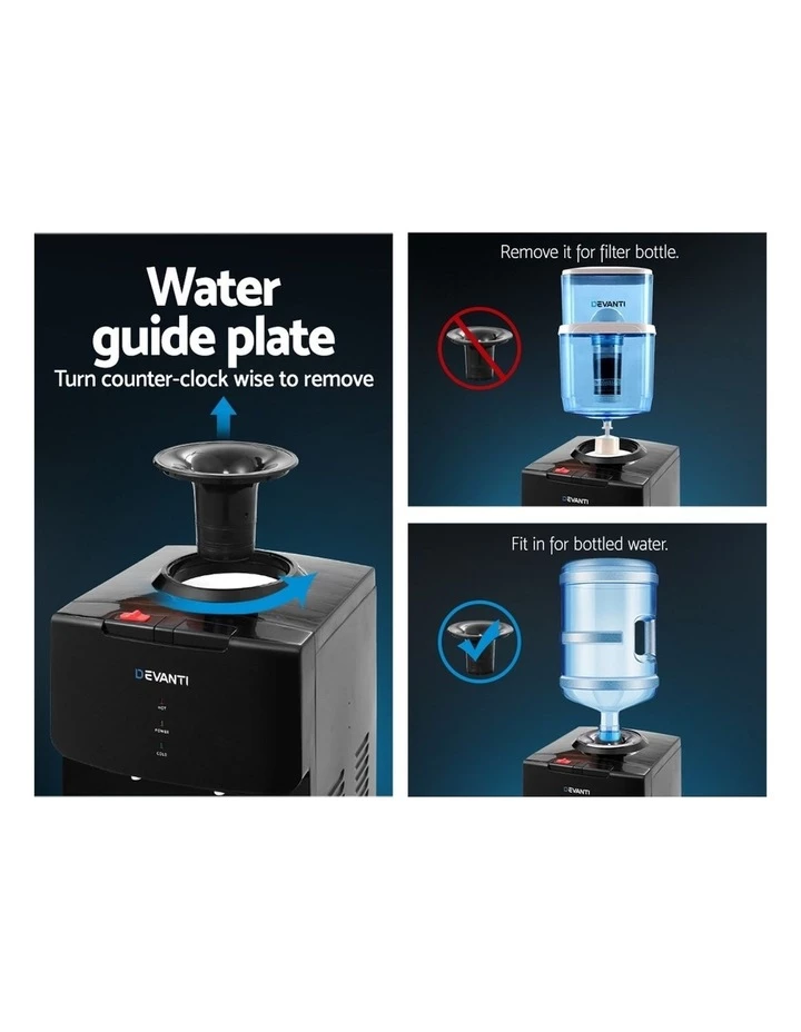 Have access to cleaner and purer water at all times with our Devanti Water Cooler. Designed to work with most bottled water or water filter containers, the cooler features an electronic refrigeration system that works quietly and reliably. It comes with a detachable water guide plate that can cater to either water containers.