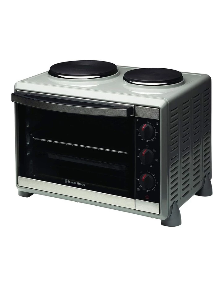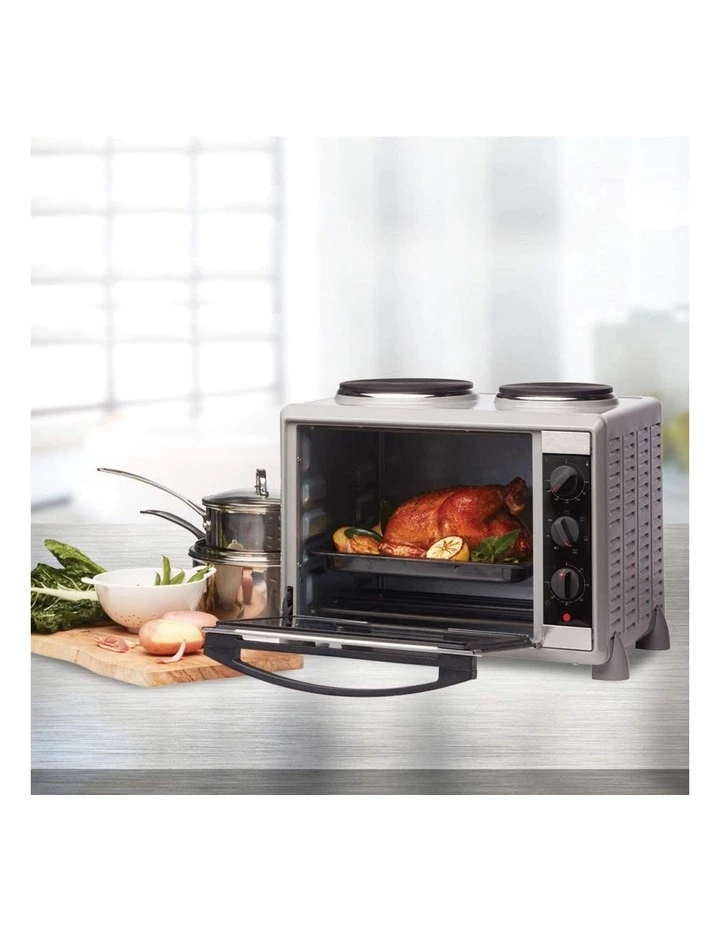 - Features: Multi-function electric compact cooker with hotplates for roasting, baking, grilling, frying & boiling; Convection oven; Double hotplate; Includes baking tray & grilling rack with handle