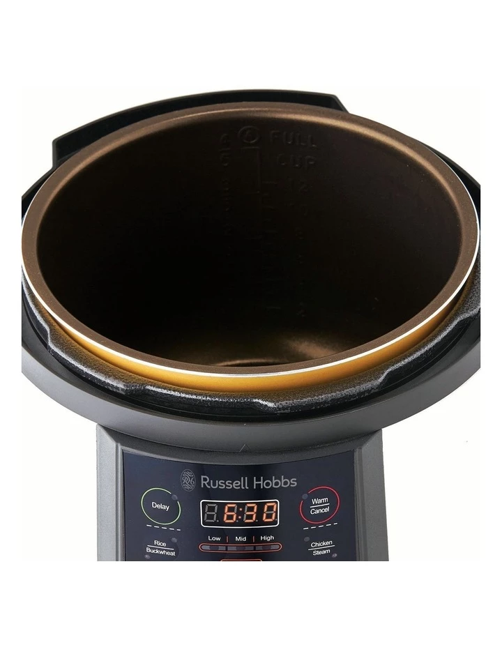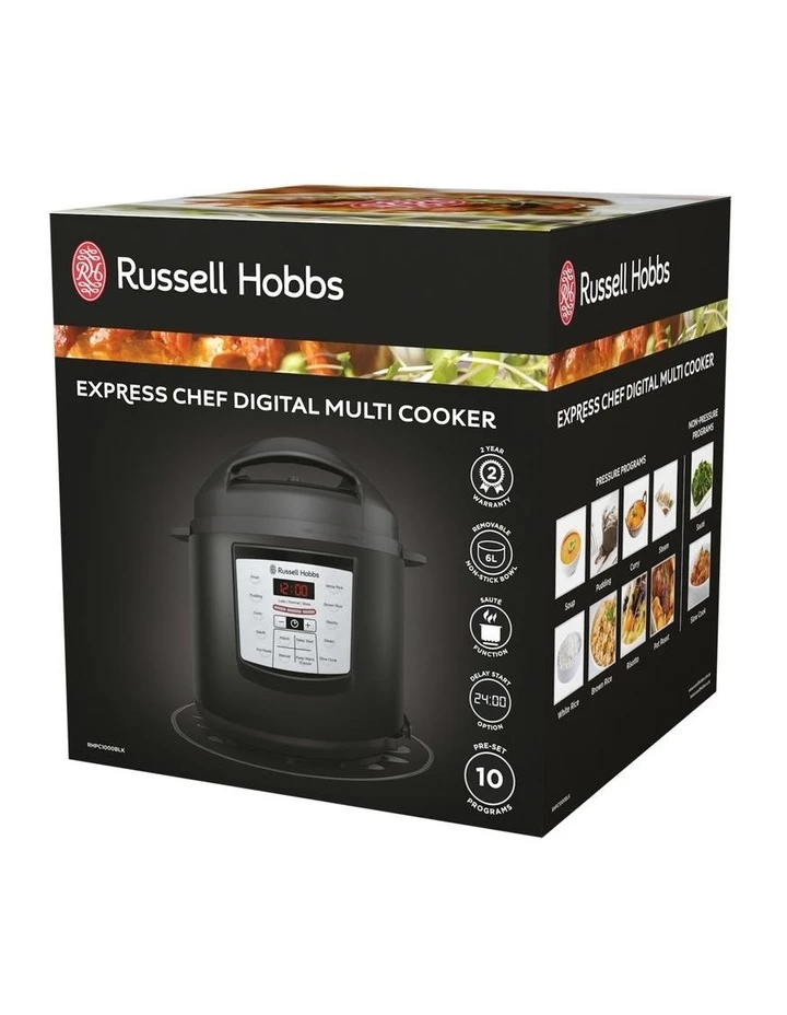 The Russell Hobbs Express Chef Digital Multi Cooker, in a premium matte black finish, features 7 pressure settings for quick meals and 4 non-pressure settings to slow cook, saut & more.