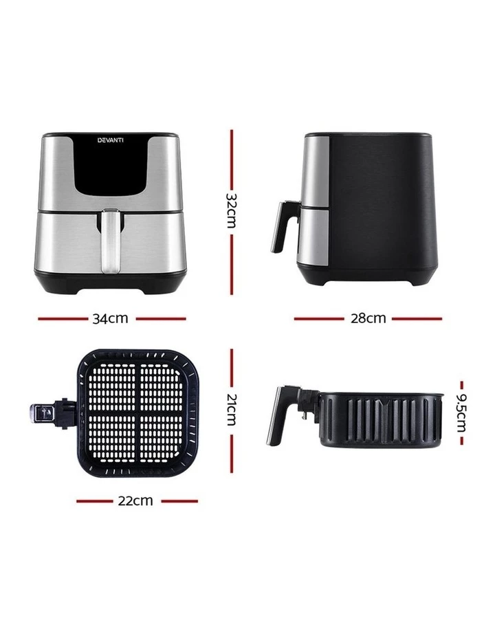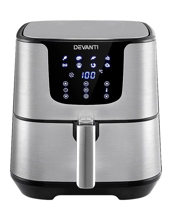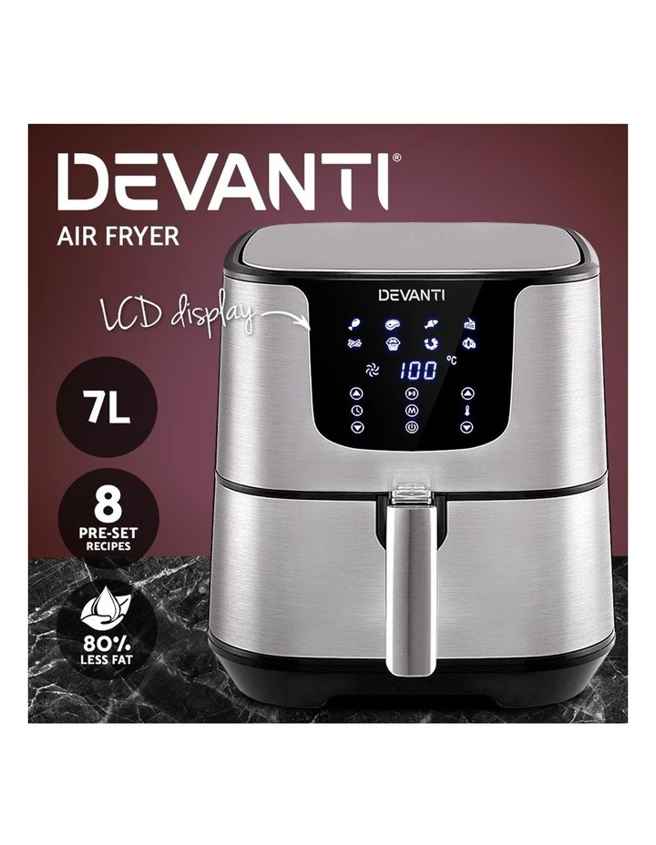 With its stunning and sleek stainless steel exterior, our Devanti Air Fryer turns the ordinary into the extraordinary. And that goes too for its exceptional cooking abilities. With its innovative air frying technology and 1700W of power, your cooking is done efficiently and thoroughly with less odours. Better still, all the wonderful cooking is done without a single drop of oil and yet is as delicious and sumptuous as traditional methods. In fact, foods cooked in in our air fryer have up to 80% less fat than deep-fried foods. This model has an all-in-one design and does not only fry food, but also roasts, grills and bakes. Just set in the cooking mode (up to eight to choose from) or time (up to 60 minutes) and temperature on the easy-to-use LCD touch controls, then leave all the hard work to the air fryer. Other great features include an auto shut-off function, non-stick pan and heat shield vent for good air circulation. The air fryer has a large 7L capacity making it suitable for most families. Most importantly, the components are dishwasher-safe, which makes the cleaning up process as easy as the cooking process.