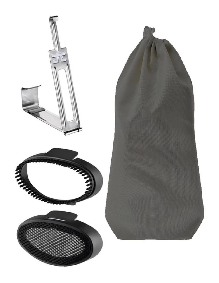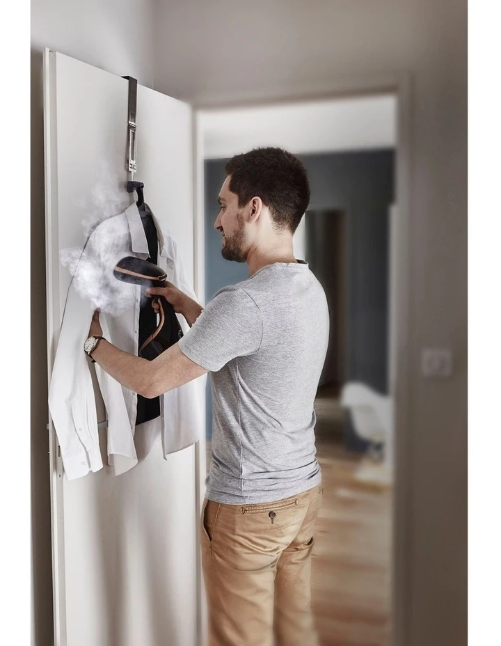 4 smart accessories: fabric brush for heavy fabrics; steam bonnet: for delicate fabrics; door hook to easily hang your clothes everywhere; tidy bag for storage