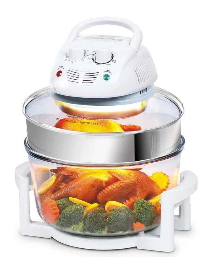 Turbo Oven uses convection heat and fan to cook healthy low fat meals speedily. They are versatile and can bake, steam, roast, broil, toast, grill and even thaw most frozen food. This particular model is easy to use with timer & temperature control dials, indicator lights and cool touch handles.