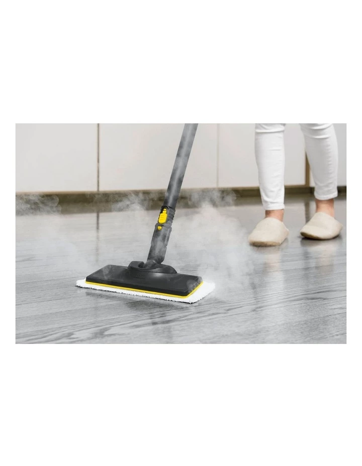 The easy and intuitive to use SC 2 EasyFix entry-level steam cleaner provides two-stage steam regulation for adapting the steam intensity to the surface and level of dirt. Practical accessory storage on the device as well as a parking position for the floor nozzle are useful details for even more convenient steam cleaning. The floor nozzle EasyFix with flexible joint guarantees excellent ergonomics and, thanks to the lamella technology, ensures perfect cleaning results. Thanks to the hook-and-loop system, the microfibre floor cloth can be quickly and easily attached to the floor nozzle and removed again without having to come into contact with dirt. The SC 2 EasyFix Karcher steam cleaner cleans entirely without chemicals and can be used anywhere. Thorough cleaning removes 99.99% of all common household bacteria from common household hard surfaces. When the various accessories are used as intended, tiles, hobs, exhaust hoods and even the smallest of gaps are hygienically cleaned. Even stubborn dirt is reliably removed.