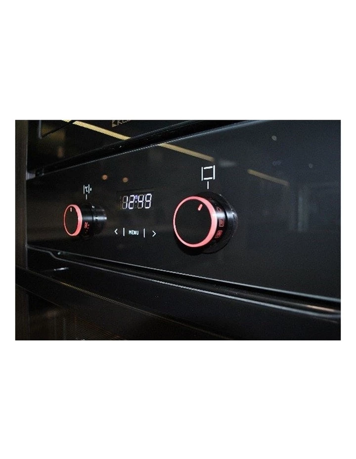 Embracing the latest European trend, the sensational new XL 75L OMF6030K 60cm multifunction oven is all black with a unique twistilluminated knobs!
