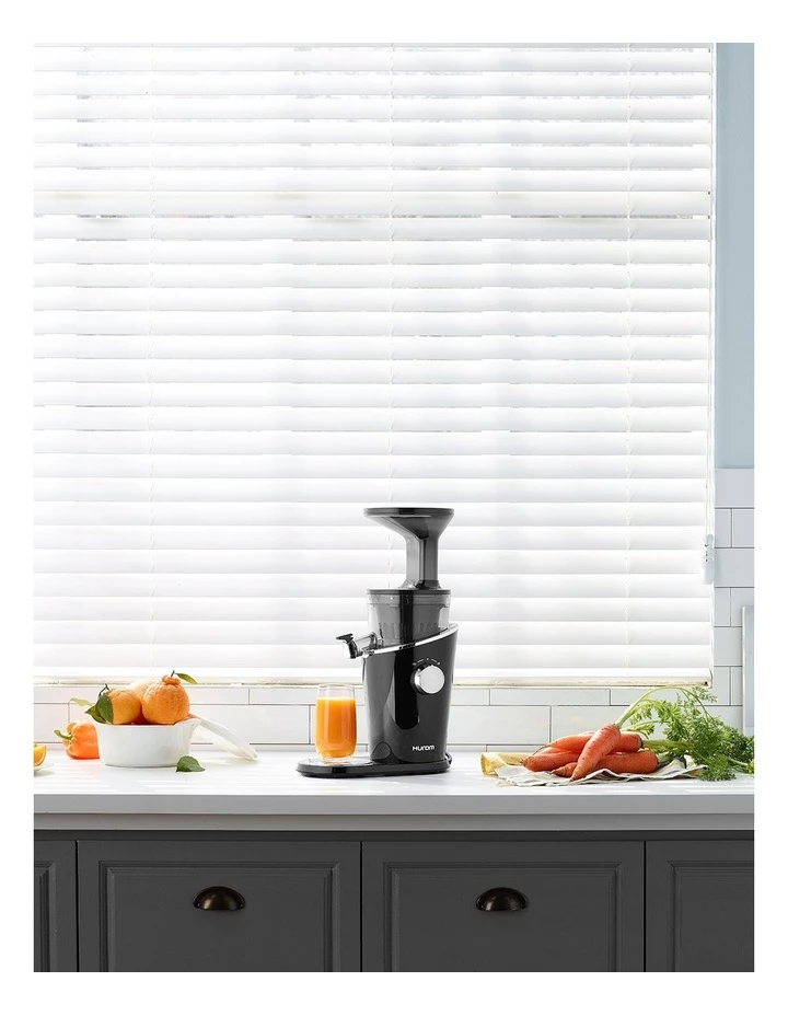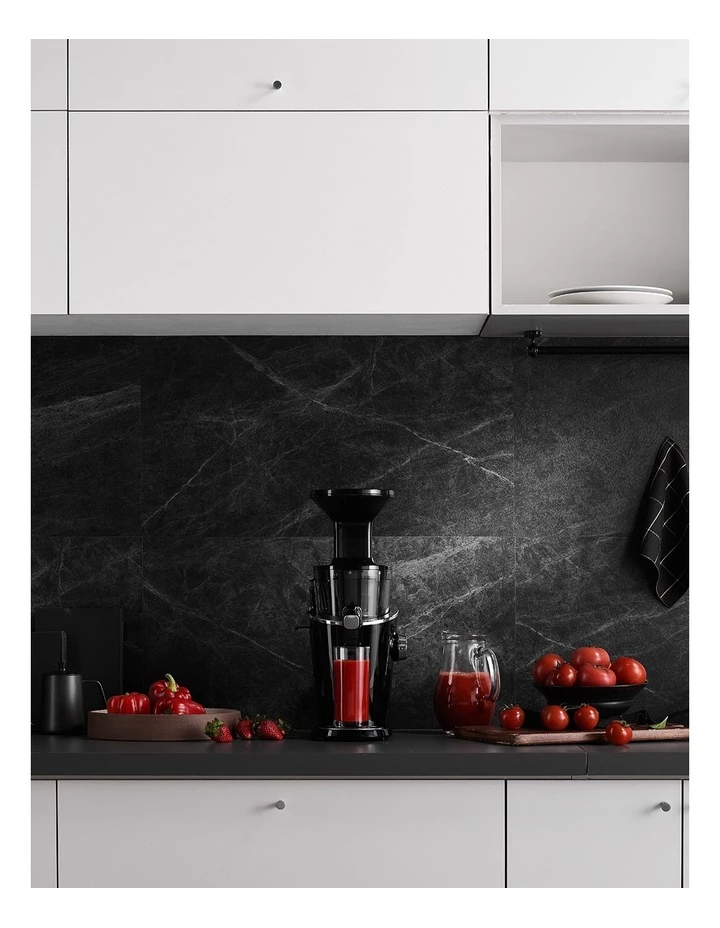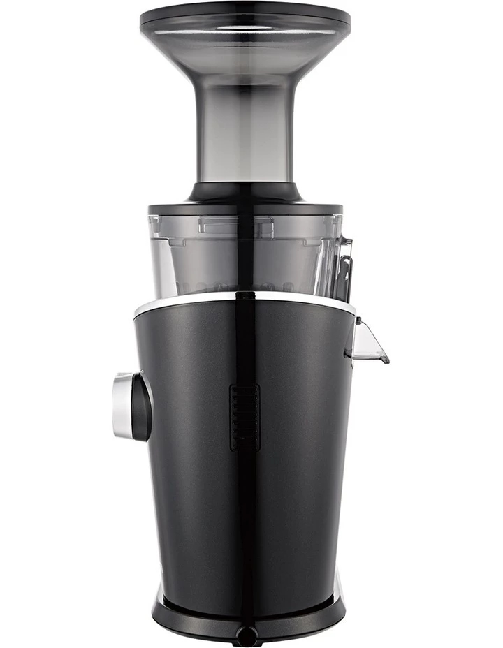 H100 Cold Press Juicer: Black Pearl. New release, easy to clean, easy to assemble and disassemble, 7 degree tilted chamber, transparent dual feed hopper, high yield. Includes fine, coarse & smoothie strainers. Dimensions 46 x 26 x 15cm