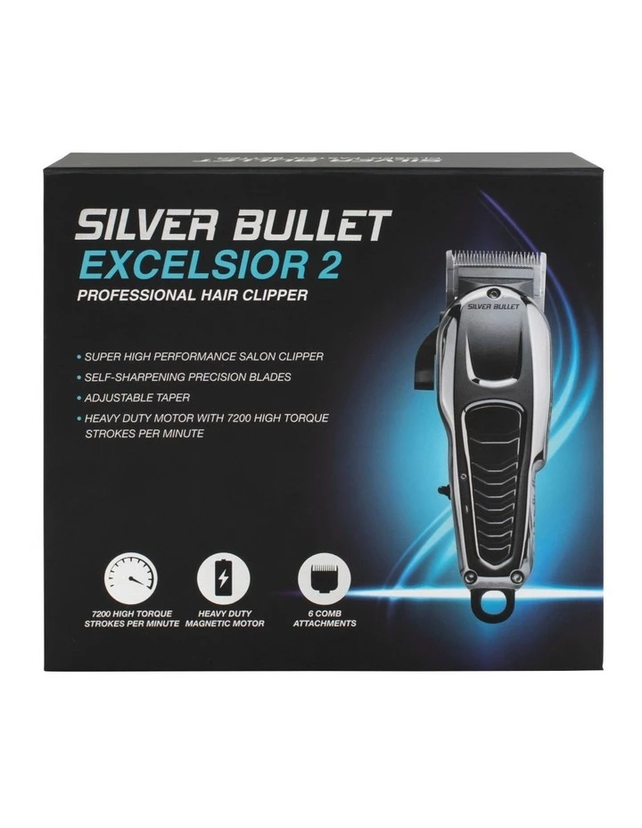 Never compromise! Silver Bullet Excelsior Professional Hair Clipper offers turbo performance which truly excels. The super powerful magnetic motor musters an incredible 7200 blade strokes a minute. Self-sharpening precision blades create superior cutting action. A smooth clipper with all the power you will ever need! Includes 6 attachment combs: 19mm/16mm/13mm/10mm/6mm/3mm, lubriating oil & cleaning brush.