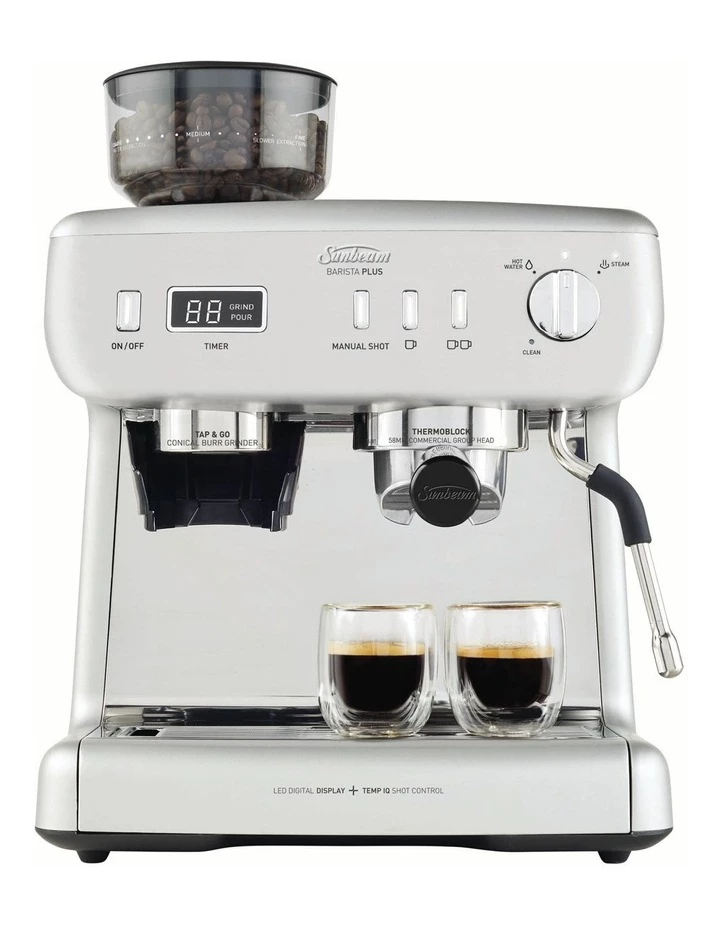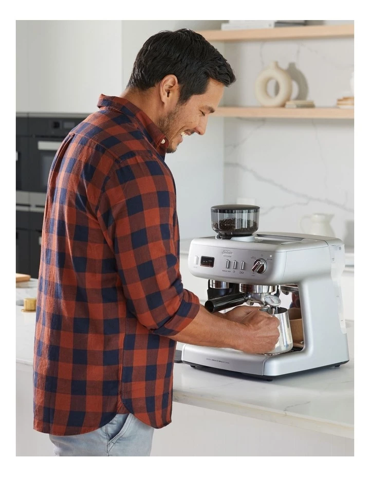 Enjoy cafe style coffee in under 3 minutes with Barista Plus Espresso Machine, the all-in-one coffee machine with the tools to help you become your own barista. Timers are used by baristas to ensure consistent and great tasting coffee. Weve added in-built timers to help you make caf style coffee at home. The integrated stainless steel conical burr grinder allows you to make full-bodied fresh espresso with beans from your local roaster. Now you can easily recreate your favourite coffee just the way you like it -whether its a latte, flat white, cappuccino or a long black.