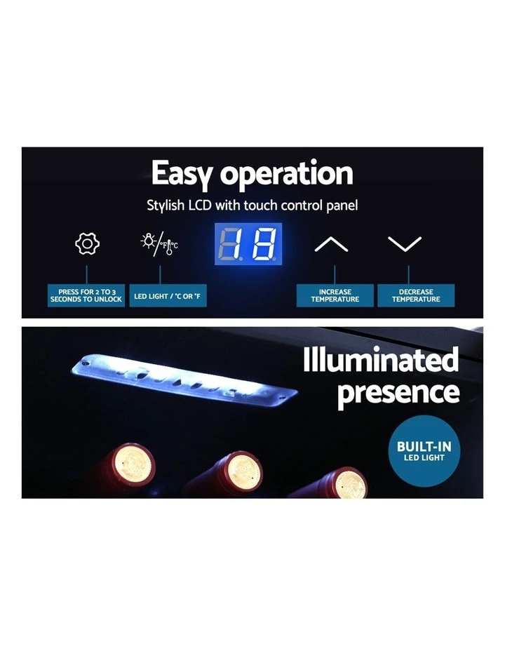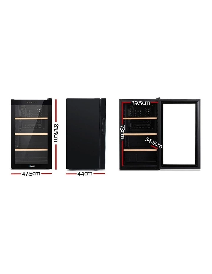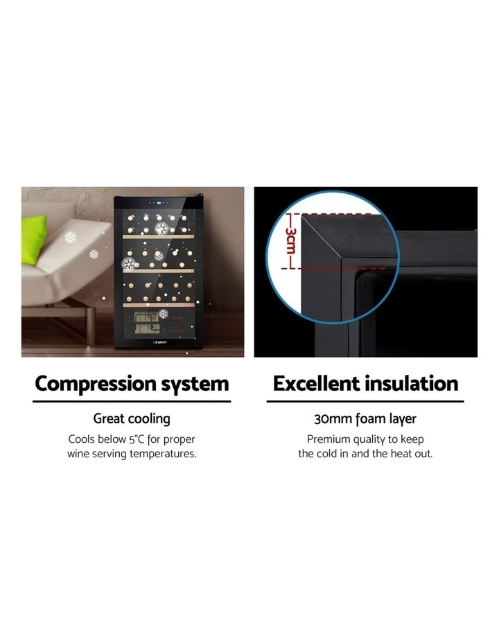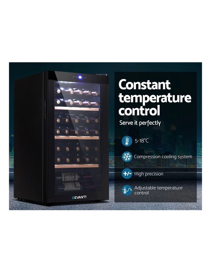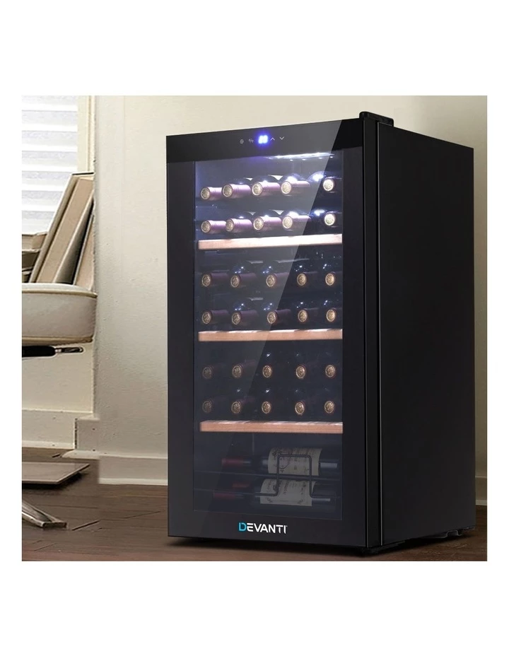 Need a good and reliable wine cooler? Look no further than our Devanti Wine Cooler. Utilising the latest high precision compression cooling technology, our wine cooler ensures your favourite vintages are kept at their prescribed temperatures with its circulated cool air. The touch control panel makes for easy temperature adjustments and the built-in interior LEDs help you to see your wines in the best light. The stylish and compact design stores up to 34 bottles of wine in a neat and tidy shelving system.