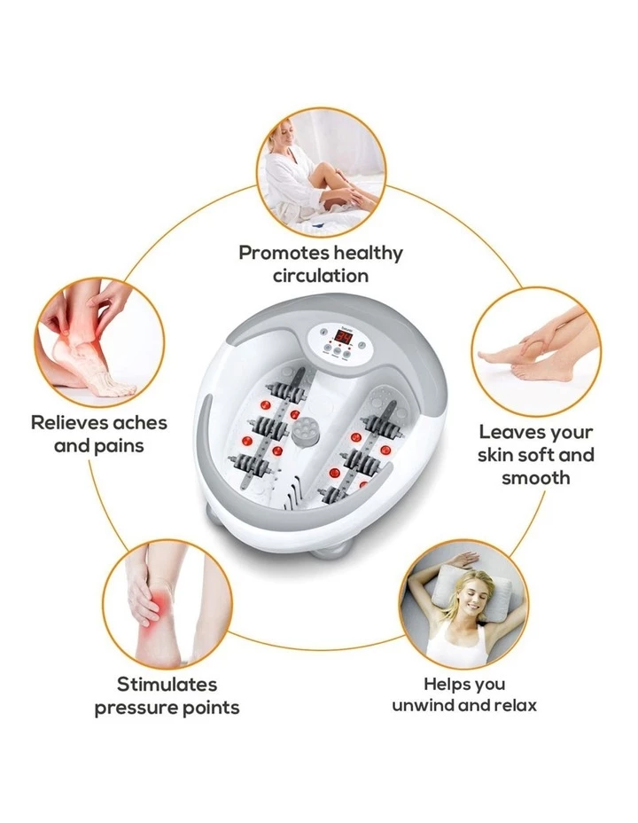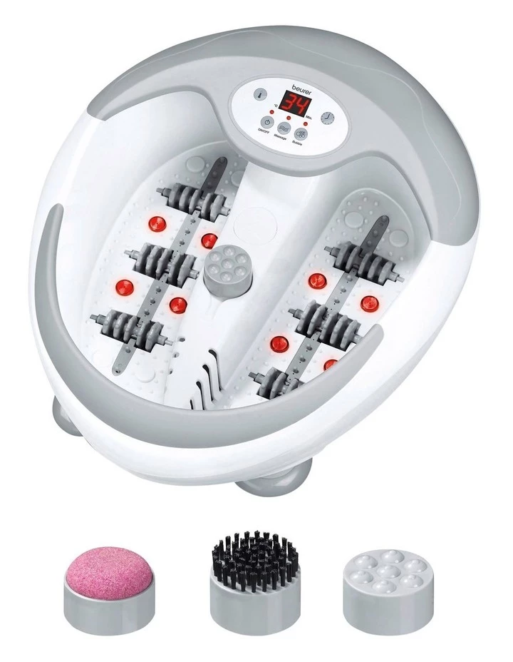 Also features dual-walled insulation for better heat retention, deep bath for full immersion, soothing infrared light spots, 6 integrated magnets for magnetic field application, 3 interchangeable pedicure attachments (exfoliator, brush and massager) that are motorised ensuring automatic rotation when pressure is applied to centre console, removable roller attachments for foot reflex zone massage, foot rest with massage rollers, splash protection, non-slip rubber feet, cord winder and more.