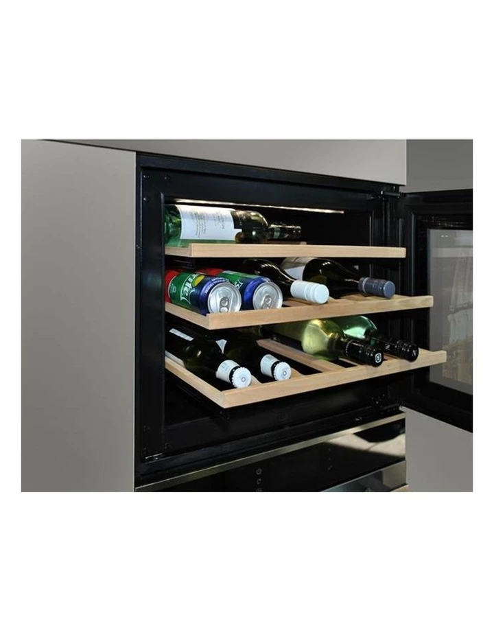 Fan cooling provides even and accurate temperature control. Other features include three beech wood telescopic shelves, White LED internal lighting with auto on/off function, inline charcoal filter to reduce mould, bacteria and odours, internal Electronic Sensor Touch controls, a door open alarm and Kleenmaid’s 5 year warranty.